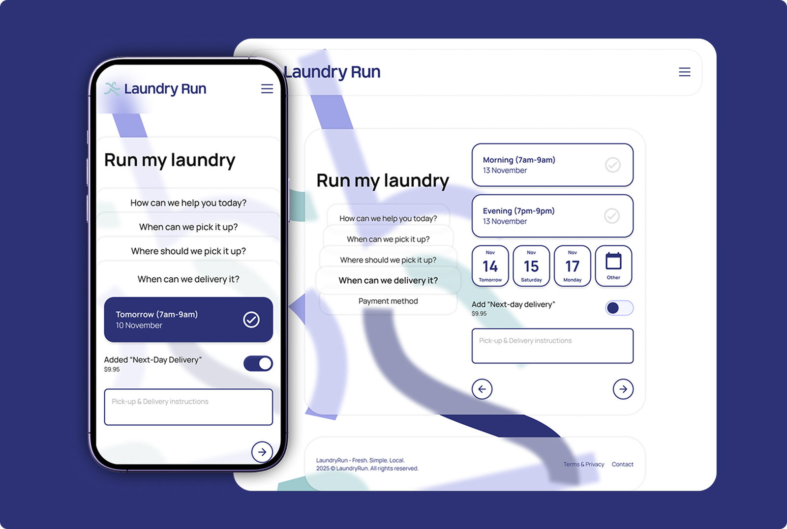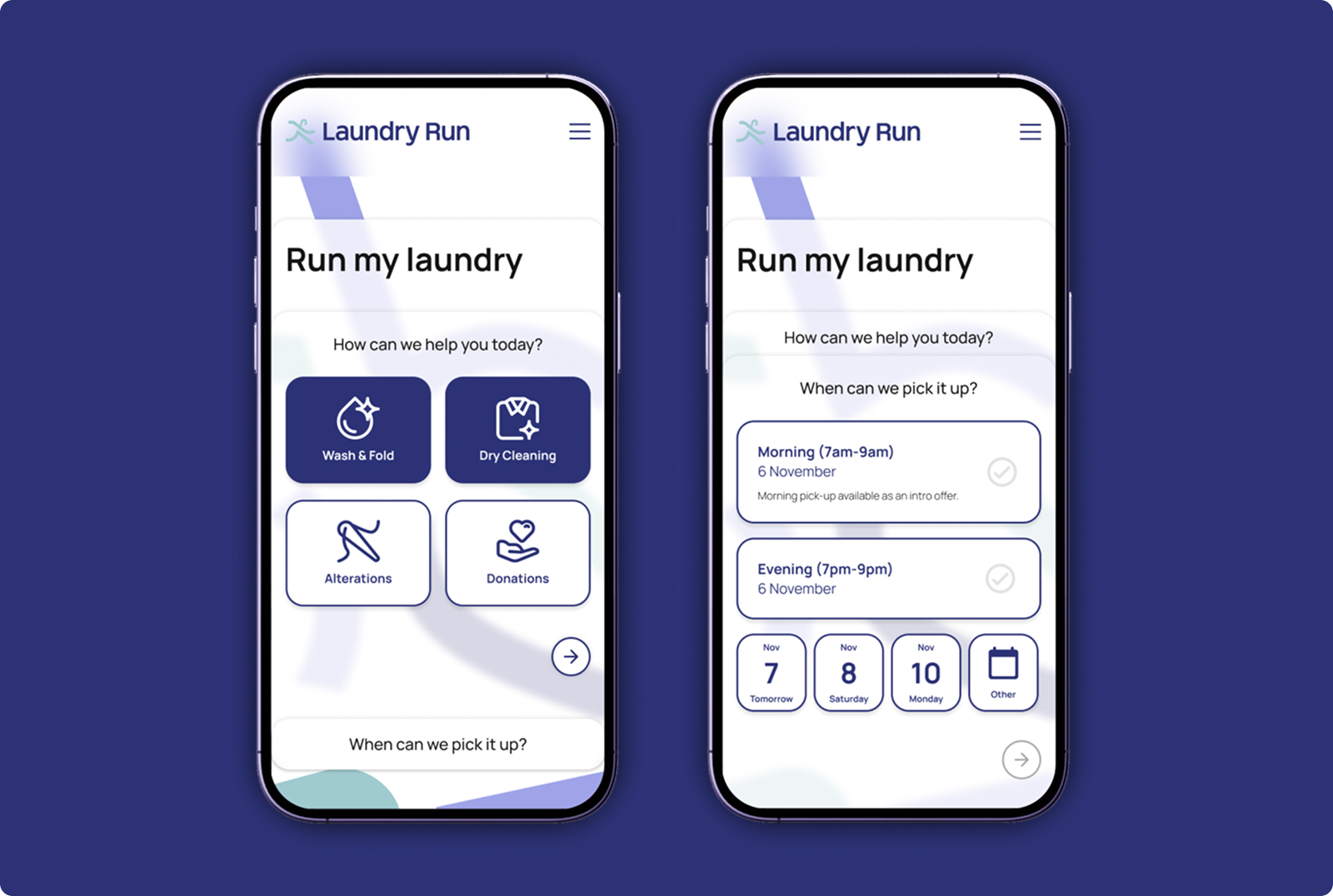 LaundryRun is a digital laundry pickup and delivery service offering wash & fold, dry cleaning, linen care, shoe care, alterations, and more — all handled with convenience and modern digital ease. The product is positioned as an urban lifestyle service that gives customers back time and simplifies household chores.